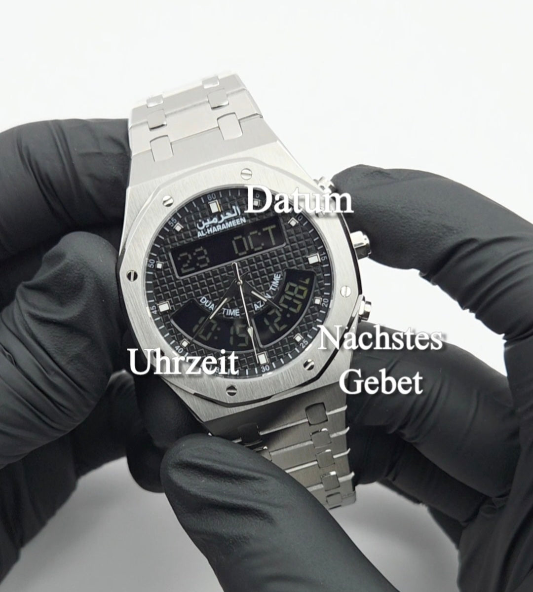 Islamische Uhren, die speziell für Muslime entwickelt wurden: Sie zeichnen sich durch religiöse Funktionen aus, wie die automatische Gebetszeiten-Anzeige, einem Qibla-Kompass auf Knopfdruck, einem Hijri- und gregorianischen Kalender, sowie viele weitere Funktionen, die jedem Muslim von Nutzen sind. Alle Uhren bieten außerdem Alarmfunktionen, eine Stoppuhr, eine Weltzeitanzeige, ein beleuchtetes Display, Wasserfestigkeit und vieles mehr.